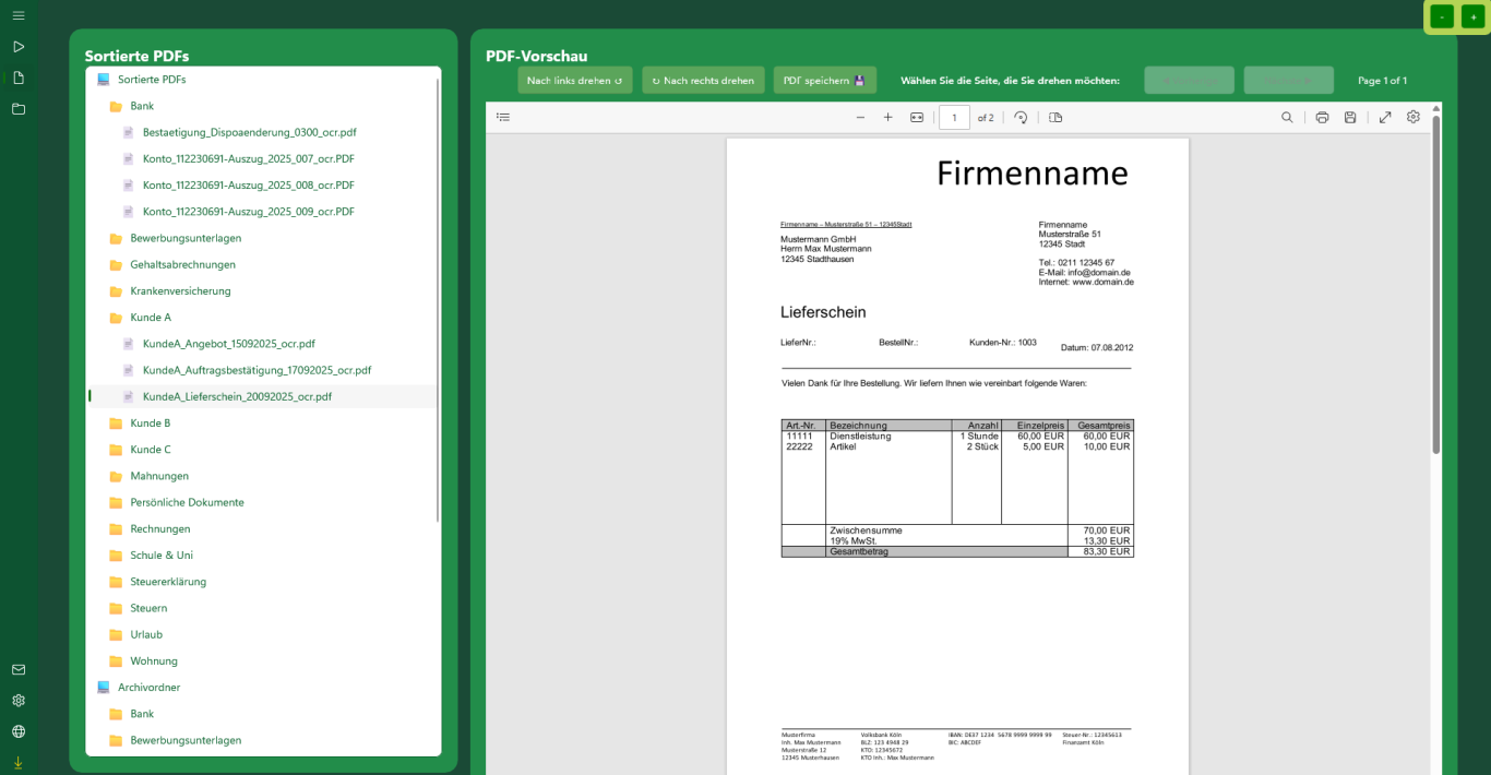 Mit diesen beiden Funktionen kannst du deine Dokumente direkt in MySorty ansehen und verwalten – ohne externe Programme oder den Windows-Explorer nutzen zu müssen.