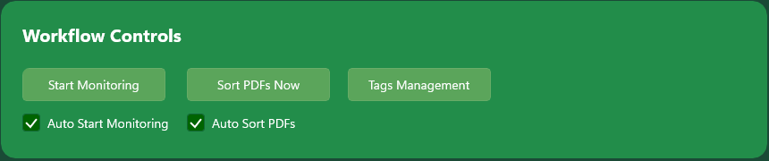 4. Workflow Controls: (Start monitoring, sort PDFs, manage automated processes)