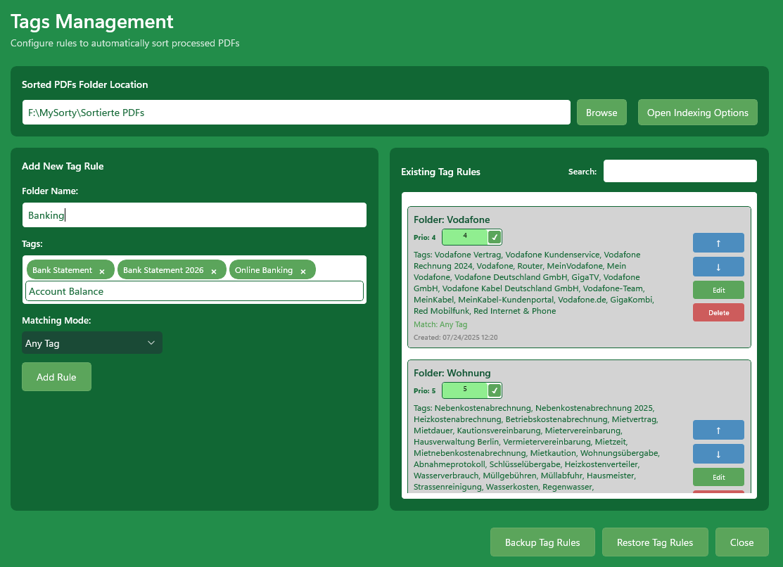 In this section, you’ll learn how to create and manage tag rules so that MySorty automatically moves your processed files into the correct folders.